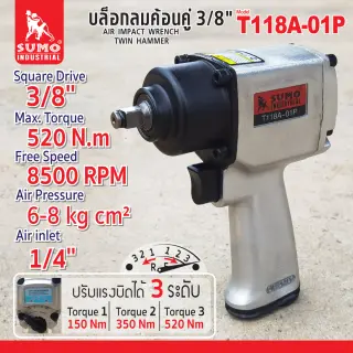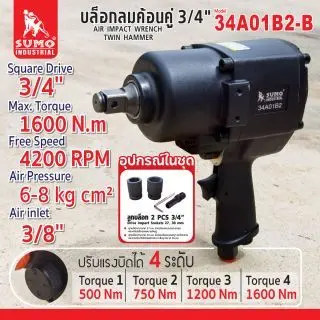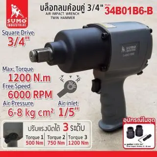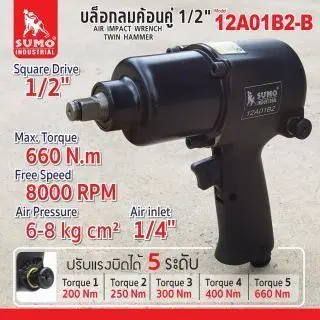 บล็อกลมค้อนเดี่ยว 1/2 นิ้ว 4 หุน รุ่น HS04K ยี่ห้อ SUMO ให้แรงบิดสูงสุด ในบรรดาบล็อคลมระบบค้อนเดี่ยว 313 N.m.ปรับแรงบิดได้ 4 ระดับ ระหว่างใช้งานไม่ต้องกังวลว่าบล็อกลมจะเกิดความร้อนสูงขณะใช้งาน เนื่องจากใช้พลังงานจากลม มีอากาศไหลเวียนทำให้บล็อกลมไม่เกิดความร้อนขณะใช้งาน อายุการใช้งานยาวนาน และราคาถูก