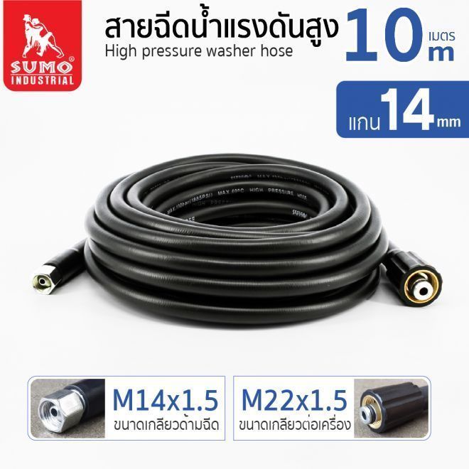 Buy สายฉีดน้ำแรงดันสูง 10 เมตร แกน 14mm (M14x1.5 M22x1.5) สายอัดฉีดน้ำแรงดันสูง 10 เมตร แกน 14mm สายอัดฉีดน้ำแรงดัน 130 bar ผลิตจากพลาสติกพีวีซี เหนียว ทนทาน และโค้งงอตามโครงสร้าง แรงดันขณะใช้งาน ( Working Pressure) : 130 bar ขนาดเกลียวด้ามฉีด : M 14 x 1.5 mm ขนาดเกลียวต่อเครื่อง : M 22 x 1.5 mm ขนาดเส่้นผ่านศูนย์กลาง :14 mm ความยาว : 10 m น้ำหนัก : 1.4 Kg