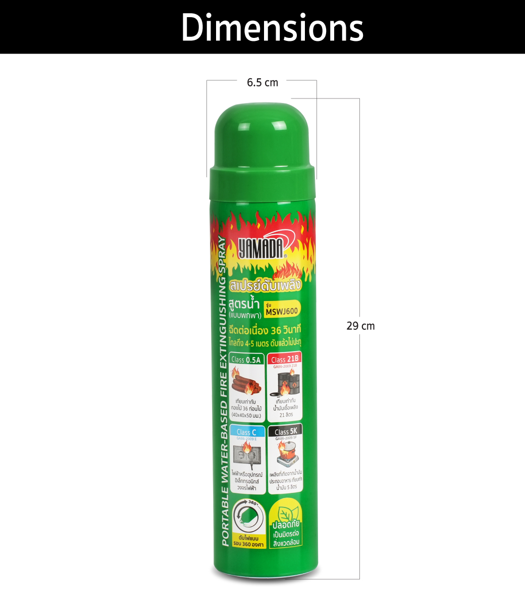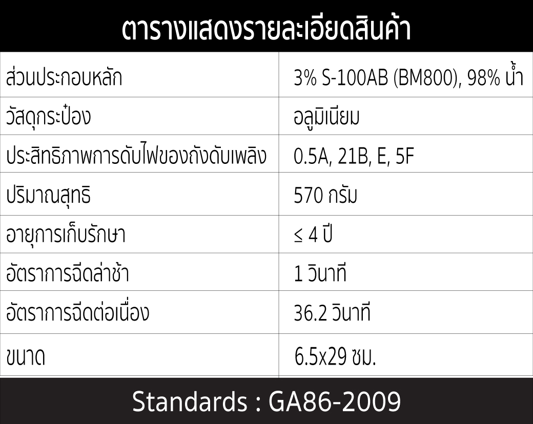 - สเปรย์ดับเพลิง มีประสิทธิภาพในการดับไฟประภท 0.5A, 21B, C, 5K