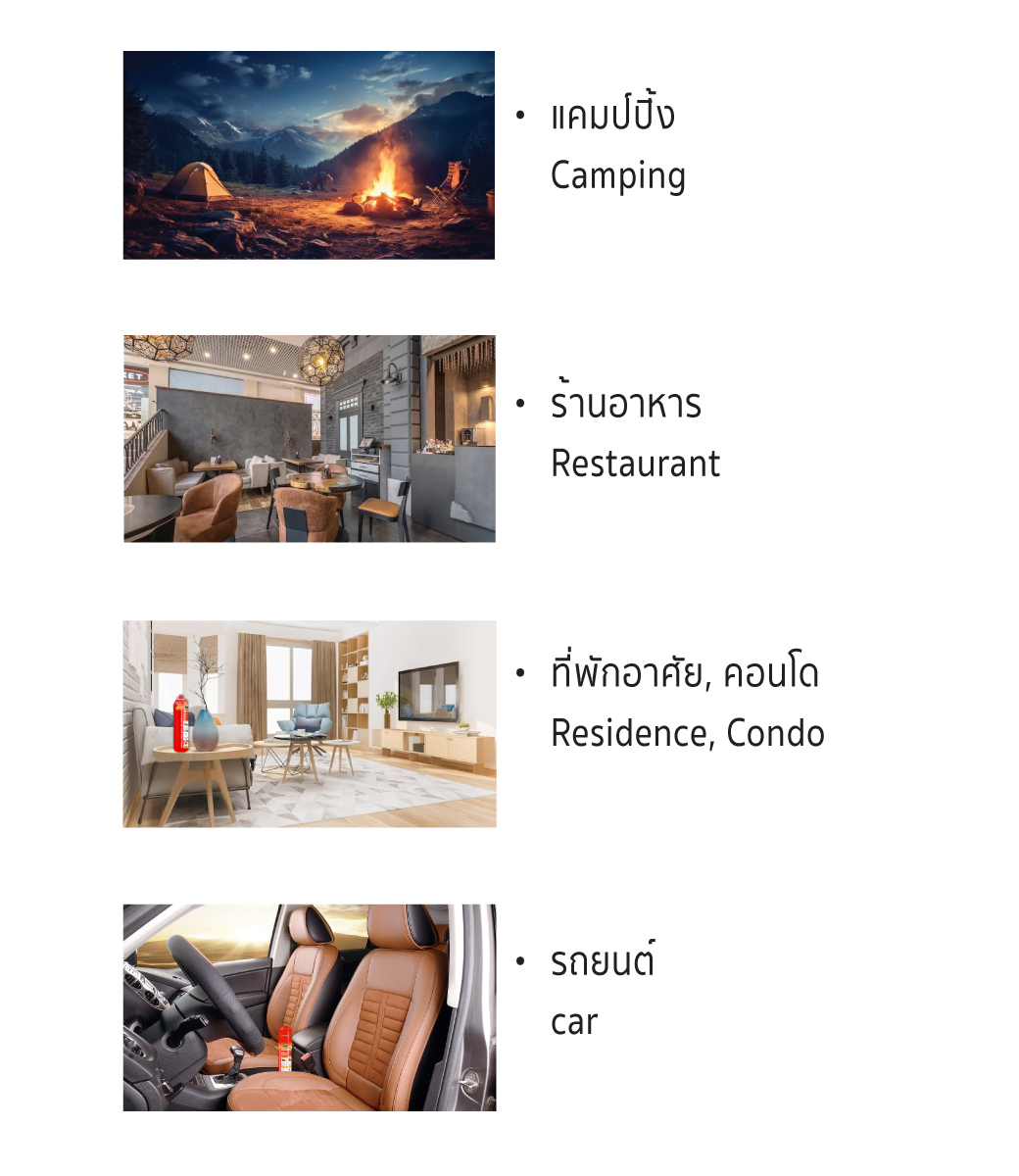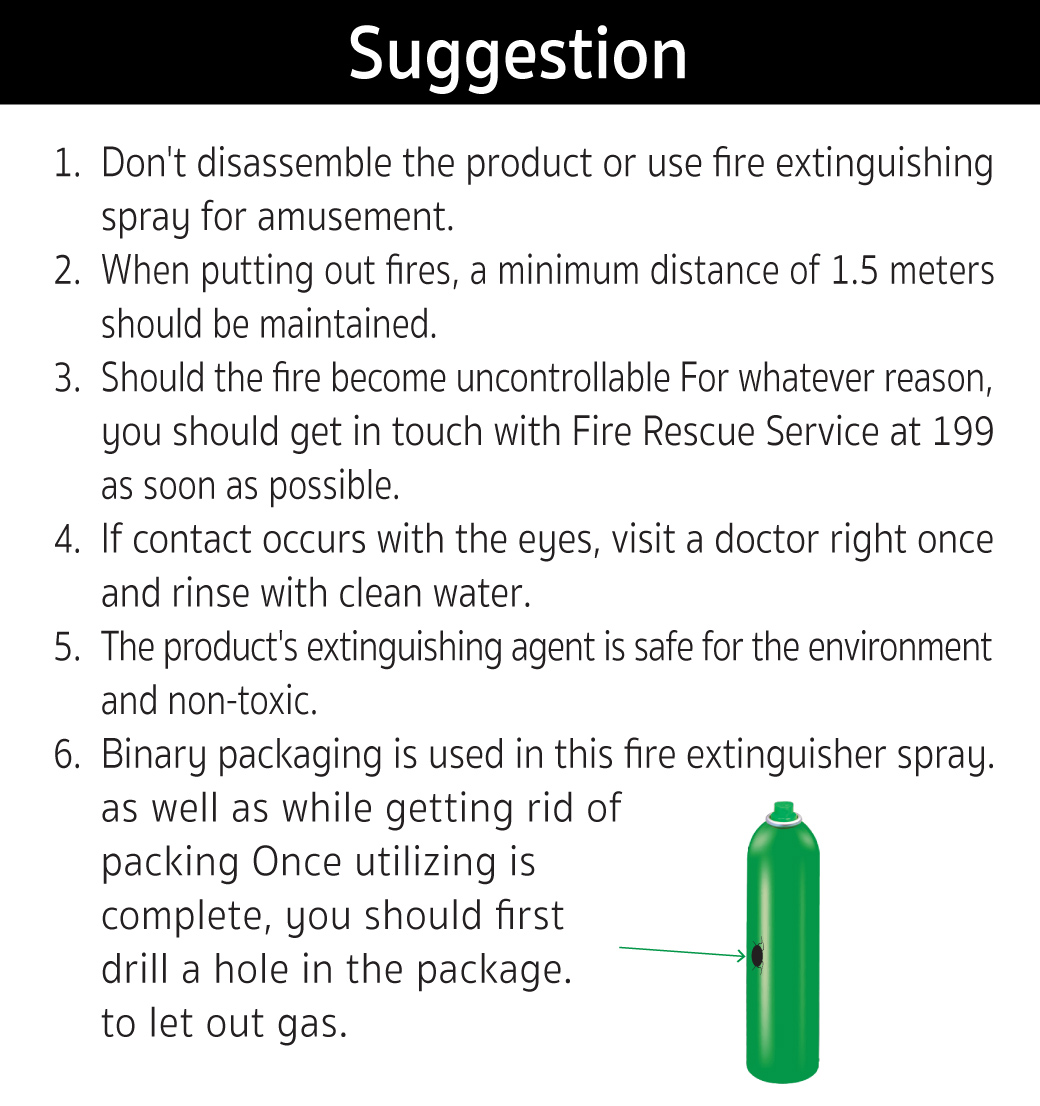 - เพื่อใช้ สเปรย์ดับเพลิง และความปลอดภัยส่วนบุคคลทั่วไป ห้ามใช้ สเปรย์ดับเพลิง เพื่อความสนุกสนาน และห้ามถอดแยกชิ้นส่วนของผลิตภัณฑ์ โดยเด็ดขาด