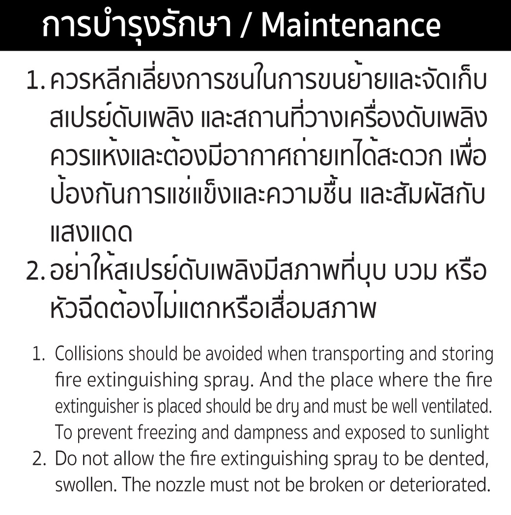 - ควรหลีกเลี่ยงการชนในการขนย้ายและจัดเก็บ สเปรย์ดับเพลิง และสถานที่วางเครื่องดับเพลิงควรแห้งและต้องมีอากาศถ่ายเทได้สะดวก