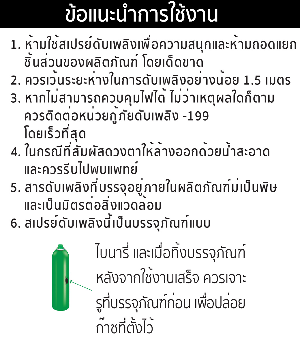 - ห้ามใช้ สเปรย์ดับเพลิง เพื่อความสนุกและห้ามถอดแยกขิ้นส่วนของผลิตภัณฑ์ โดยเด็ดขาด
