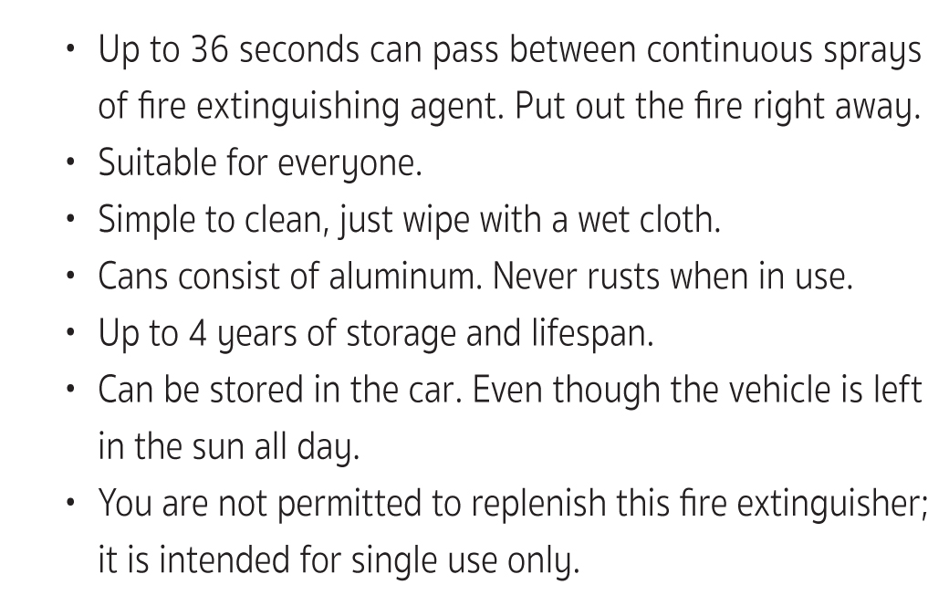 - สเปรย์ดับเพลิง ขนาดเล็ก น้ำหนักเบา รูปแบบเรียบง่าย พกพาสะดวก
