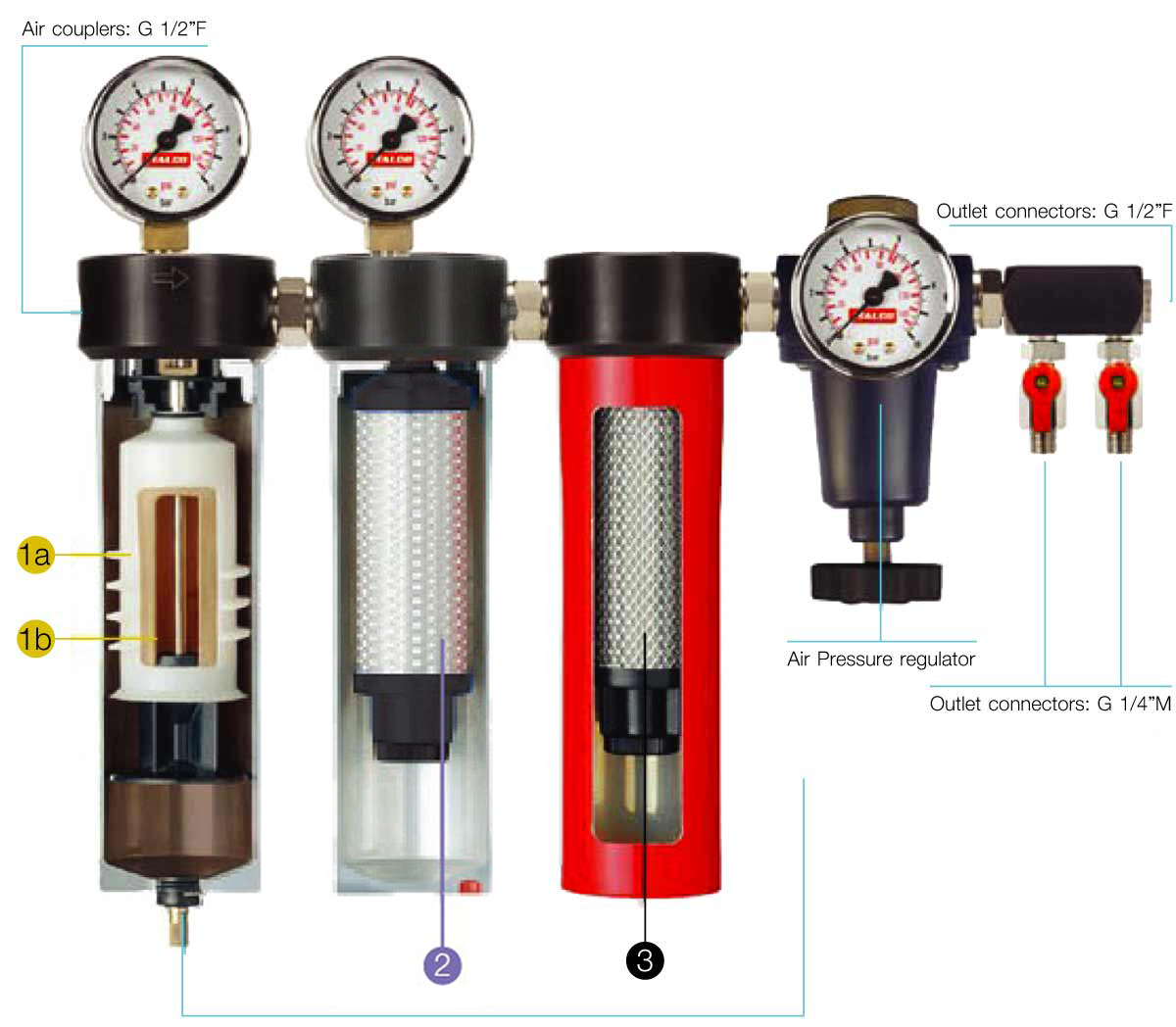 ตัวกรองลม ท่อที่ 1 : การกำจัดหยดน้ำมันและไอน้ำ (Removing oil droplets and condensate) 1a ตัวไซโคลนที่ออกแบบเป็นพิเศษ ทำหน้าที่แยกเอาน้ำและน้ำมันออก 1b ตัวกรองลมแบบโลหะทำหน้าที่กรองฝุ่นขนาดมากกว่า 5 ไมครอน (แนะนำเปลี่ยนทุก 6 เดือน)