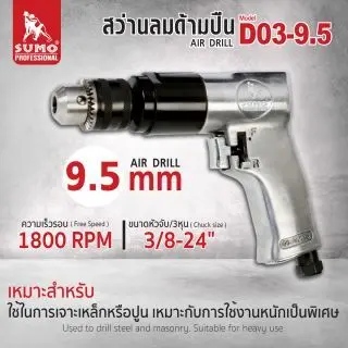 - สว่านลมด้ามตรง 6.5 mm รุ่น D02-6.5 SUMO เหมาะสำหรับใช้เจาะเหล็กหรือปูน และการใช้งานที่หนักเป็นพิเศษ และพื้นที่เข้าถึงยาก ทางเลือกที่ดีสำหรับการเจาะ