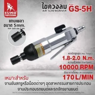 • ไขควงลมด้ามปืน 1/4 นิ้ว (2 หุน) รุ่น SD80 ยี่ห้อ SUMO เหมาะสำหรับงานขันสกรูหรือน็อตต่างๆ อุตสาหกรรม สายการประกอบโดยเฉพาะอย่างยิ่งกับการประกอบรถยนต์ และรถจักรยานยนต์