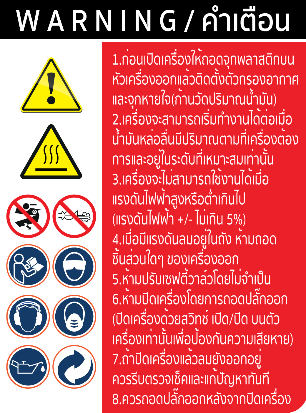 - เครื่อง ปั๊มลม จะไม่สามารถใช้งานได้เมื่อแรงดันไฟฟ้าสูงหรือต่ำเกินไป (แรงดันไฟฟ้า +/-ไม่เกิน 5%)