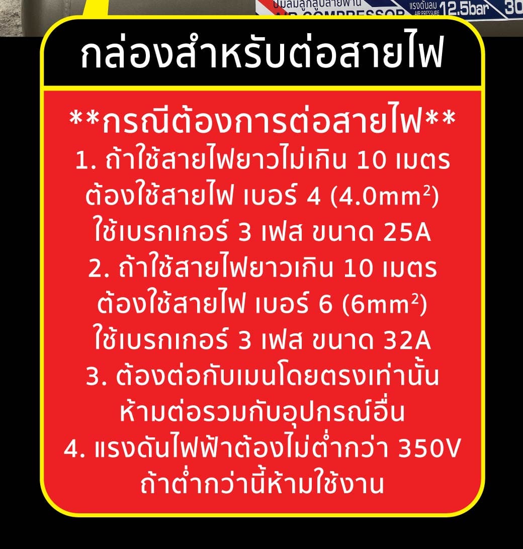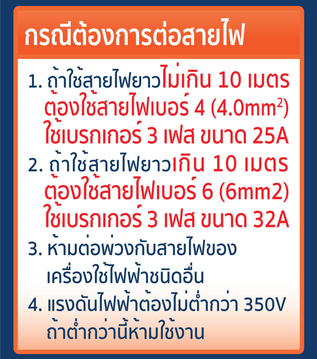 - ถ้าใช้สายไฟยาวเกิน 10 เมตร ต้องใช้สายไฟเบอร์ 6 (6mm2) ใช้เบรกเกอร์ 3 เฟส ขนาด 32A