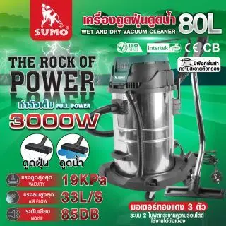 - เครื่องดูดฝุ่นดูดน้ำ 30 ลิตร SUMO ตัวถังแสตนเลสต้านทานการกัดกร่อนไม่เกิดสนิม มอเตอร์ทองแดง 1200W ระบบ 2 ใบพัด ระบายความร้อนได้ดี ใช้ฟิลเตอร์ชนิด HEPA กรองได้ในระดับ 0.3 ไมครอน แรงลม 28.3L/S แรงดูด 17KPa